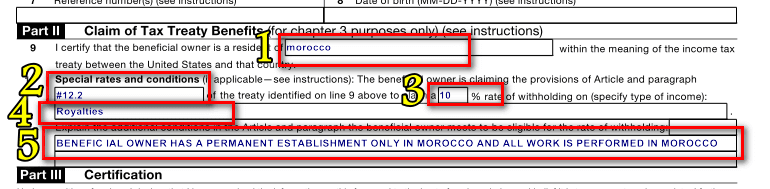 6 - هناك خانة خاصة بقتطاعات الضرائب والتي سوف تقوم بملء فيها معلومات . وهذه الخانة اسمها calim of tax treaty benefits .