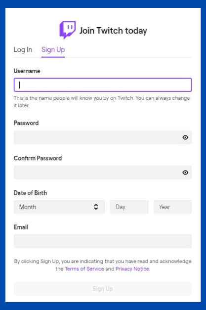 من اجل انشاء حساب على تويتش ستحتاج الى اتباع الخطوات التالية: