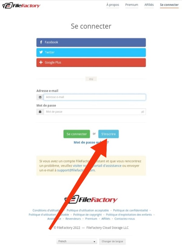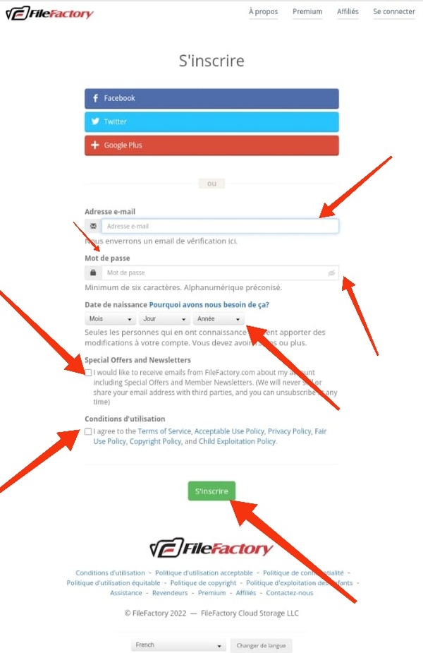 4 بعد ذلك ستظهر لك واجهة جديدة تطلب منك ملأ بعض المعلومات الشخصية الخاصة بك، حيث سيطلب منك الموقع كتابة البريد الالكتروني الخاص بك و كتابة رقم السر، ويجب على كلمة المرور أن تحتوي على العديد من الاحرف و الرموز و الأرقام، وبعد ذلك ستقوم بتحديد تاريخ الإزدياد، وبعدها ستقوم بالموافقة على الأحكام والشروط الخاصة بموقع Filefactory، وفي الأخير ستقوم بالنقر على " s inscrie".