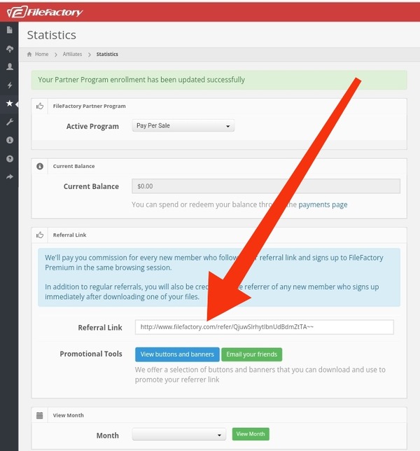 طريقة الربح من الاحالة هي عن طريق مشاركة رابط الإحالة الخاصة بك، فالعديد من الناس يحققون من خلال هده الطريقة مئات الدولارات شهريا، فموقع Filefactory يقدم لك رابط إحالة خاص بك و على كل شخص قام بتحميل الملف من ذلك الرابط سوف تربح نسبة من الأرباح و الذي يصل إلى 15 في المئة من أرباح الشخص الذي تسجل من خلال رابط الإحالة الخاصة بك.