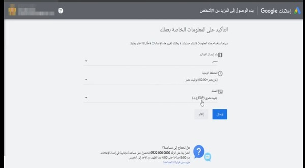 5 بعد ذلك سوف يطلب منك الموقع ملأ بعض المعلومات مثل البلد الذي تقيم فيه بالإضافة إلى العملة الخاصة ببلدك...إلخ، وبعدها ستقوم بالنقر على "إرسال"، ومبروك عليك لقد قمت بإنشاء حساب على Google adword او نقول ads google.