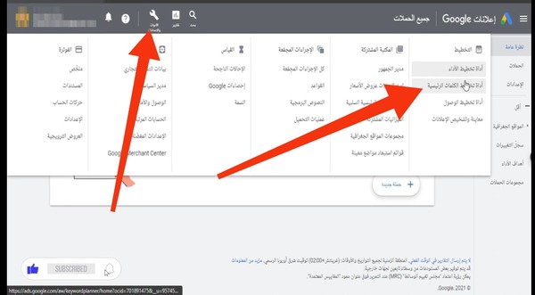 1 سوف تقوم بالدخول إلى الواجهة الرئيسية للموقع، وسوف تقوم بالنقر على " الأدوات و الإعلانات" الموجودة في أعلى الصفحة، وبعدها قم بالنقر على "أداة التخطيط الكلمات الرئسية".