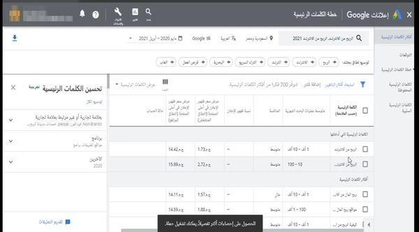 4 وعندها سوف تجد العديد من الكلمات المفتاحية التي لها علاقة بموضوع الربح من الانترنت، وسوف تجد تفاصيل دقيقة جدا عن تلك الكلمة المفتاحية مثل متوسط عملية البحث الشهري و سعر الكلمة المفتاحية...إلخ.