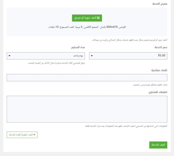 3- في هده الواجهة سيطلب منك الموقع ملأ بعض المعلومات، مثل سعر الخدمة بالإضافة إلى مدة التسليم، كما سيطلب منك رفع صورة الخدمة، وكنصيحة مني حاول أن تكون مثيرة للاهتمام، وتكون مختلفة عن الأخرين، كما سيطلب منك الموقع إضافة بعض الكلمات المفتاحية والتي يجب أن تكون كلمات ذات بحت عالي داخل الموقع، وفي الأخير سوف تقوم بالنقر على "أضف الخدمة"، وبعدها سوف تنتظر حتى يتم قبول خدمتك من طرف خمسات.