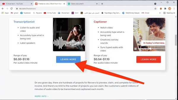 من أجل الربح من خلال هذا الموقع كل ما عليك فعله هو أن تقوم بتحويل الملف الصوتي إلى نص، حيث يقدم لك موقع rev مجموعة من الملفات الصوتية وكل ما يجب عليك فعله هو أن تقوم بكتابة ما تسمعه في الملف الصوتي، ويجب عليك أن تكون دقيقا في تحويل الملف الصوتي إلى نص ويجب أن لا يحتوي على أخطاء إملائية.