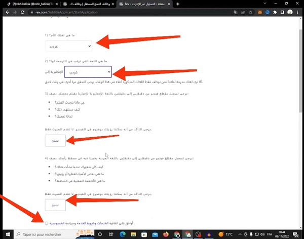 7- بعد ذلك ستظهر واجهة جديدة تطلب منك ملأ بعض المعلومات، في البداية تطلب منك إختيار لغة الأم الخاصة بك وفي هذه الحالة ستختار اللغة العربية، وبعد ذلك سوف يطلب منك الموقع إختيار اللغة التي تريد الترجمة بها، وبعد ذلك سوف يطلب منك الموقع تسجيل مقطع فيديو مدته دقيقتين باللغة الانجليزية تتحدث فيه عن فلم معين.