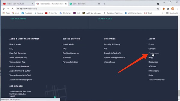 1- سوف تقوم بالدخول إلى جوجل أو إلى متصفح جوجل كروم وتقوم بكتابة في خانة البحث كلمة"rev.com", سوف تظهر الواجهة الرئيسية لموقع rev ، كل ما عليك سوى أن تقوم بالذهاب إلى أسفل الصفحة، وبعد ذلك ستجد العديد من الإختيارات كل ما عليك سوى الظغط على كلمة"freelancer".